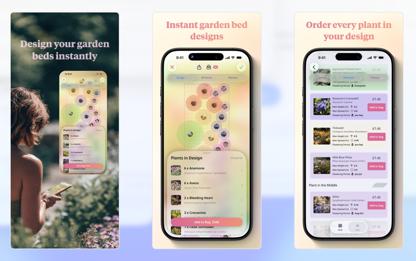 Users can enter the size of their garden space and instantly generate a planting design using plants suited to their soil, sunlight, and conditions. The result is a balanced planting layout designed to create colour, structure, and seasonal interest.